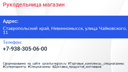 Рукодельница, магазин по адресу Ставропольский край, Невинномысск, улица Чайковского, 11 в дальнейшем Организация, размещена в следующих категориях: