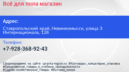 Всё для пола, магазин по адресу Ставропольский край, Невинномысск, улица 3 Интернационала, 128 в дальнейшем Организация, размещена в следующих категориях: