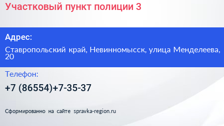 Участковый пункт полиции №3 по адресу Ставропольский край, Невинномысск, улица Менделеева, 20 в дальнейшем Организация, размещена в следующих категориях: