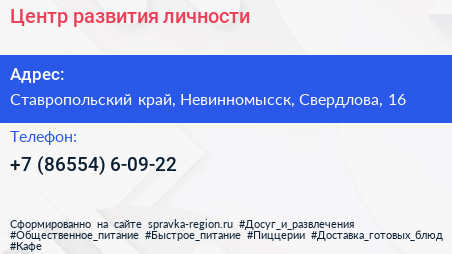 Центр развития личности по адресу Ставропольский край, Невинномысск, Свердлова, 16 в дальнейшем Организация, размещена в следующих категориях: