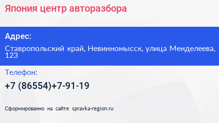 Япония, центр авторазбора по адресу Ставропольский край, Невинномысск, улица Менделеева, 123 в дальнейшем Организация, размещена в следующих категориях: