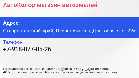 АвтоКолор, магазин автоэмалей по адресу Ставропольский край, Невинномысск, Достоевского, 22а в дальнейшем Организация, размещена в следующих категориях: