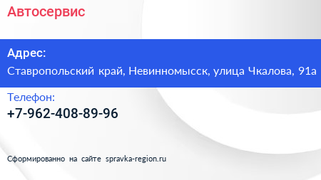Автосервис по адресу Ставропольский край, Невинномысск, улица Чкалова, 91а в дальнейшем Организация, размещена в следующих категориях: