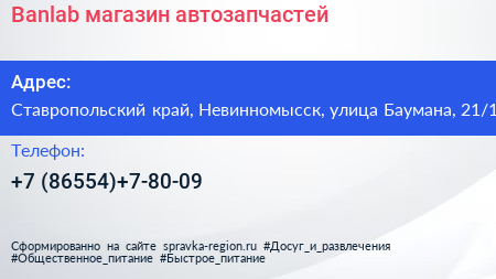 Banlab, магазин автозапчастей по адресу Ставропольский край, Невинномысск, улица Баумана, 21/1 в дальнейшем Организация, размещена в следующих категориях: