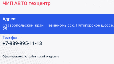 ЧИП-АВТО, техцентр по адресу Ставропольский край, Невинномысск, Пятигорское шоссе, 25 в дальнейшем Организация, размещена в следующих категориях: