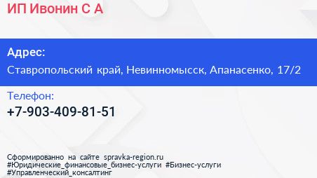 ИП Ивонин С.А. по адресу Ставропольский край, Невинномысск, Апанасенко, 17/2 в дальнейшем Организация, размещена в следующих категориях: