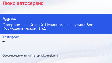 Люкс, автосервис по адресу Ставропольский край, Невинномысск, улица Зои Космодемьянской, 1 к1 в дальнейшем Организация, размещена в следующих категориях: