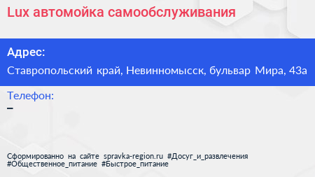 Lux, автомойка самообслуживания по адресу Ставропольский край, Невинномысск, бульвар Мира, 43а в дальнейшем Организация, размещена в следующих категориях: