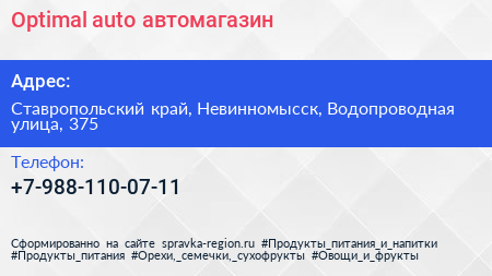 Optimal-auto, автомагазин по адресу Ставропольский край, Невинномысск, Водопроводная улица, 375 в дальнейшем Организация, размещена в следующих категориях: