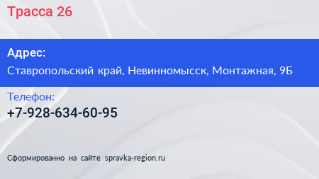 Трасса-26 по адресу Ставропольский край, Невинномысск, Монтажная, 9Б в дальнейшем Организация, размещена в следующих категориях: