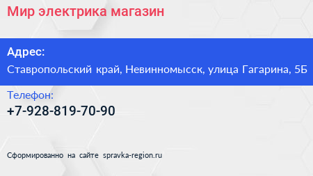 Мир электрика, магазин по адресу Ставропольский край, Невинномысск, улица Гагарина, 5Б в дальнейшем Организация, размещена в следующих категориях: