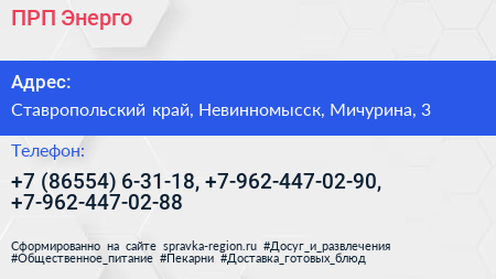 ПРП Энерго по адресу Ставропольский край, Невинномысск, Мичурина, 3 в дальнейшем Организация, размещена в следующих категориях: