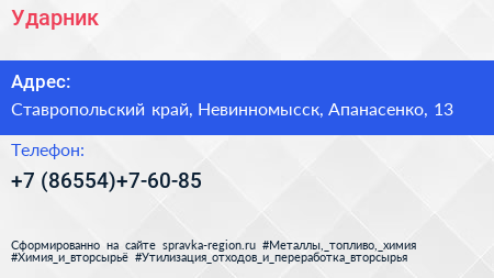 Ударник по адресу Ставропольский край, Невинномысск, Апанасенко, 13 в дальнейшем Организация, размещена в следующих категориях: