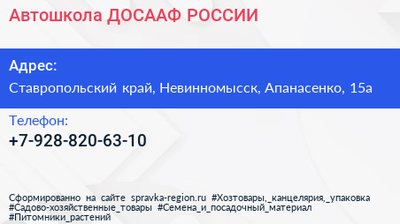 Автошкола, ДОСААФ РОССИИ по адресу Ставропольский край, Невинномысск, Апанасенко, 15а в дальнейшем Организация, размещена в следующих категориях:
