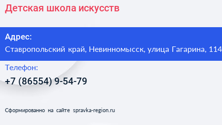 Детская школа искусств по адресу Ставропольский край, Невинномысск, улица Гагарина, 114 в дальнейшем Организация, размещена в следующих категориях: