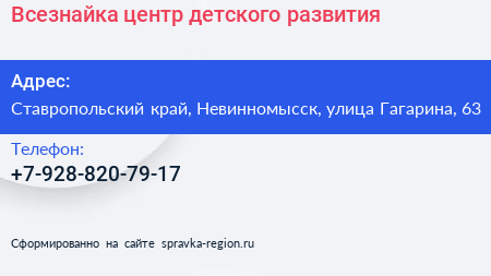 Всезнайка, центр детского развития по адресу Ставропольский край, Невинномысск, улица Гагарина, 63 в дальнейшем Организация, размещена в следующих категориях: