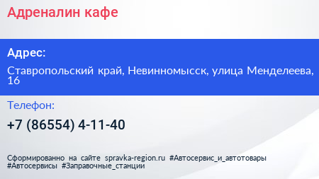 Адреналин, кафе по адресу Ставропольский край, Невинномысск, улица Менделеева, 16 в дальнейшем Организация, размещена в следующих категориях: