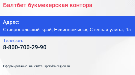 Балтбет, букмекерская контора по адресу Ставропольский край, Невинномысск, Степная улица, 45 в дальнейшем Организация, размещена в следующих категориях: