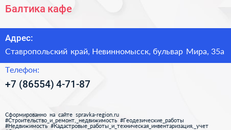 Балтика, кафе по адресу Ставропольский край, Невинномысск, бульвар Мира, 35а в дальнейшем Организация, размещена в следующих категориях: