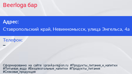 Beerloga, бар по адресу Ставропольский край, Невинномысск, улица Энгельса, 4а в дальнейшем Организация, размещена в следующих категориях: