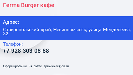Ferma Burger, кафе по адресу Ставропольский край, Невинномысск, улица Менделеева, 32 в дальнейшем Организация, размещена в следующих категориях:
