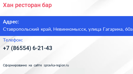 Хан, ресторан-бар по адресу Ставропольский край, Невинномысск, улица Гагарина, 60а в дальнейшем Организация, размещена в следующих категориях: