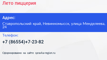 Лето, пиццерия по адресу Ставропольский край, Невинномысск, улица Менделеева, 24 в дальнейшем Организация, размещена в следующих категориях: