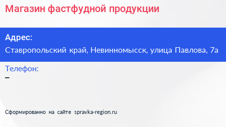 Магазин фастфудной продукции по адресу Ставропольский край, Невинномысск, улица Павлова, 7а в дальнейшем Организация, размещена в следующих категориях: