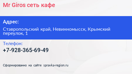Mr.Giros, сеть кафе по адресу Ставропольский край, Невинномысск, Крымский переулок, 1 в дальнейшем Организация, размещена в следующих категориях: