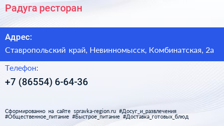 Радуга, ресторан по адресу Ставропольский край, Невинномысск, Комбинатская, 2а в дальнейшем Организация, размещена в следующих категориях: