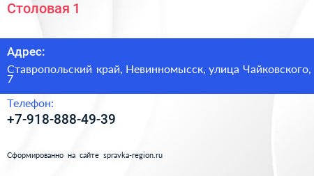 Столовая №1 по адресу Ставропольский край, Невинномысск, улица Чайковского, 7 в дальнейшем Организация, размещена в следующих категориях: