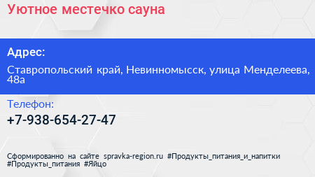 Уютное местечко, сауна по адресу Ставропольский край, Невинномысск, улица Менделеева, 48а в дальнейшем Организация, размещена в следующих категориях: