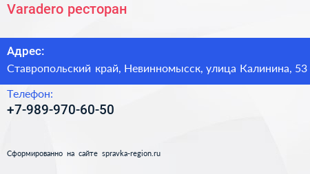 Varadero, ресторан по адресу Ставропольский край, Невинномысск, улица Калинина, 53 в дальнейшем Организация, размещена в следующих категориях: