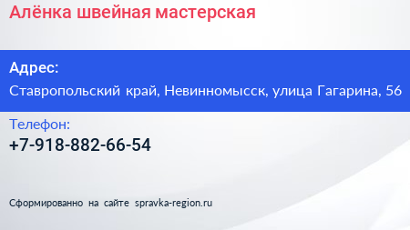 Алёнка, швейная мастерская по адресу Ставропольский край, Невинномысск, улица Гагарина, 56 в дальнейшем Организация, размещена в следующих категориях: