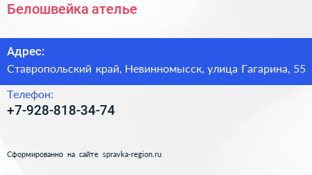 Белошвейка, ателье по адресу Ставропольский край, Невинномысск, улица Гагарина, 55 в дальнейшем Организация, размещена в следующих категориях: