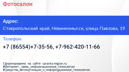Фотосалон по адресу Ставропольский край, Невинномысск, улица Павлова, 19 в дальнейшем Организация, размещена в следующих категориях: