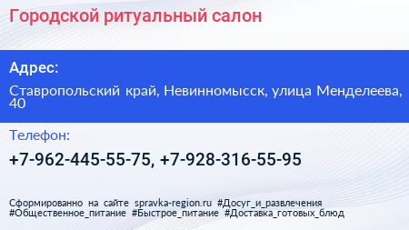 Городской ритуальный салон по адресу Ставропольский край, Невинномысск, улица Менделеева, 40 в дальнейшем Организация, размещена в следующих категориях: