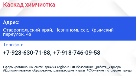 Каскад, химчистка по адресу Ставропольский край, Невинномысск, Крымский переулок, 4а в дальнейшем Организация, размещена в следующих категориях: