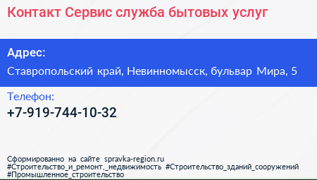 Контакт-Сервис, служба бытовых услуг по адресу Ставропольский край, Невинномысск, бульвар Мира, 5 в дальнейшем Организация, размещена в следующих категориях: