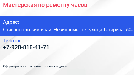 Мастерская по ремонту часов по адресу Ставропольский край, Невинномысск, улица Гагарина, 60а в дальнейшем Организация, размещена в следующих категориях:
