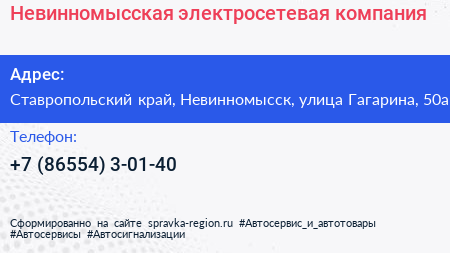 Невинномысская электросетевая компания по адресу Ставропольский край, Невинномысск, улица Гагарина, 50а в дальнейшем Организация, размещена в следующих категориях: