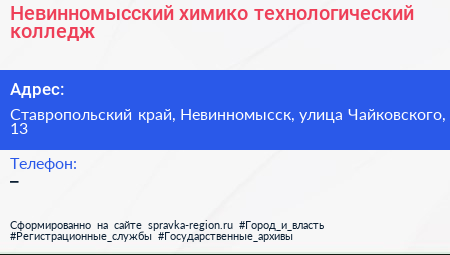 Невинномысский химико-технологический колледж по адресу Ставропольский край, Невинномысск, улица Чайковского, 13 в дальнейшем Организация, размещена в следующих категориях: