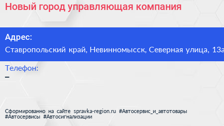 Новый город, управляющая компания по адресу Ставропольский край, Невинномысск, Северная улица, 13а в дальнейшем Организация, размещена в следующих категориях: