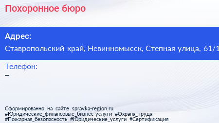 Похоронное бюро по адресу Ставропольский край, Невинномысск, Степная улица, 61/1 в дальнейшем Организация, размещена в следующих категориях: