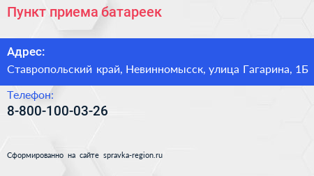 Пункт приема батареек по адресу Ставропольский край, Невинномысск, улица Гагарина, 1Б в дальнейшем Организация, размещена в следующих категориях: