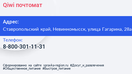 Qiwi, почтомат по адресу Ставропольский край, Невинномысск, улица Гагарина, 28а в дальнейшем Организация, размещена в следующих категориях: