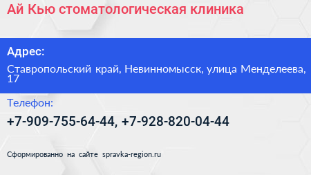 Ай Кью, стоматологическая клиника по адресу Ставропольский край, Невинномысск, улица Менделеева, 17 в дальнейшем Организация, размещена в следующих категориях: