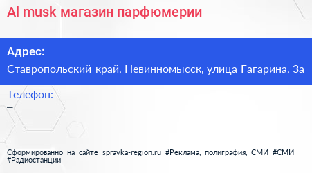 Al-musk, магазин парфюмерии по адресу Ставропольский край, Невинномысск, улица Гагарина, 3а в дальнейшем Организация, размещена в следующих категориях: