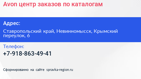 Avon, центр заказов по каталогам по адресу Ставропольский край, Невинномысск, Крымский переулок, 6 в дальнейшем Организация, размещена в следующих категориях: