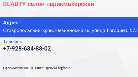 BEAUTY, салон-парикмахерская по адресу Ставропольский край, Невинномысск, улица Гагарина, 57а в дальнейшем Организация, размещена в следующих категориях: